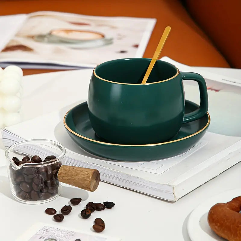 Con su diseño de color sólido, este conjunto está disponible en un elegante tono verde oscuro, complementado por un borde dorado y una cuchara dorada a juego, lo que lo convierte en una adición con estilo a su colección de vajilla.